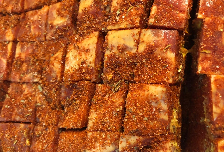 After this, apply the Piggy Mix barbecue rub over the mustard-coated pork belly. There's no need to apply the rub to the underside with the fat layer.